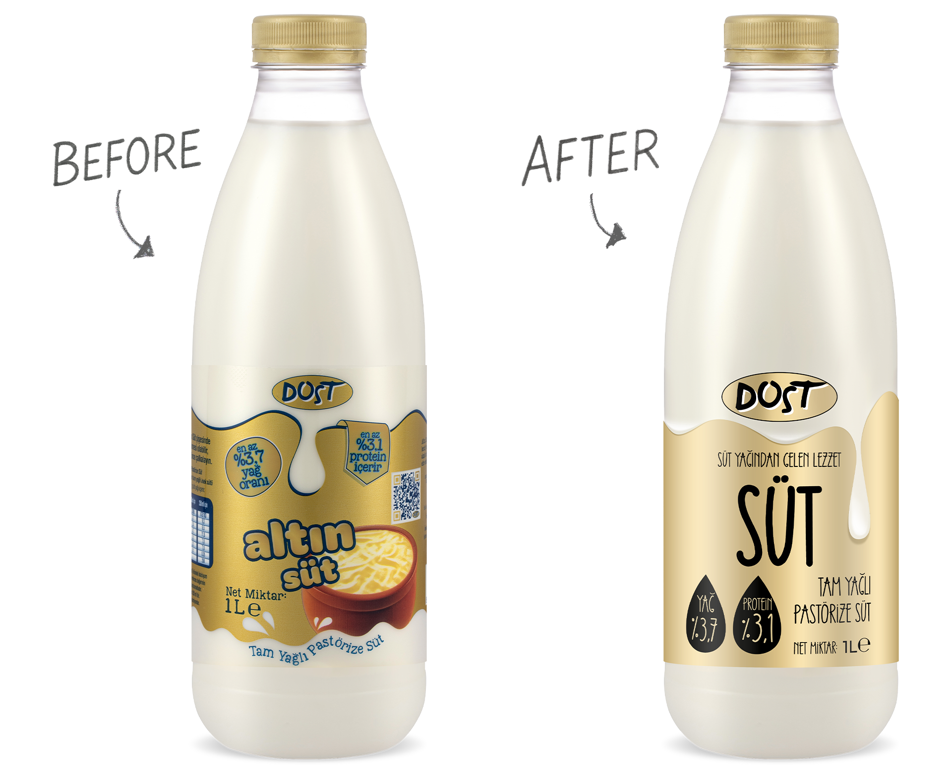Sonuç: Dost Süt ambalajı, tüketicilerin alışık olduğu güven verici öğeleri korurken, markaya modern, güçlü ve raflarda daha dikkat çekici bir kimlik kazandırdı.