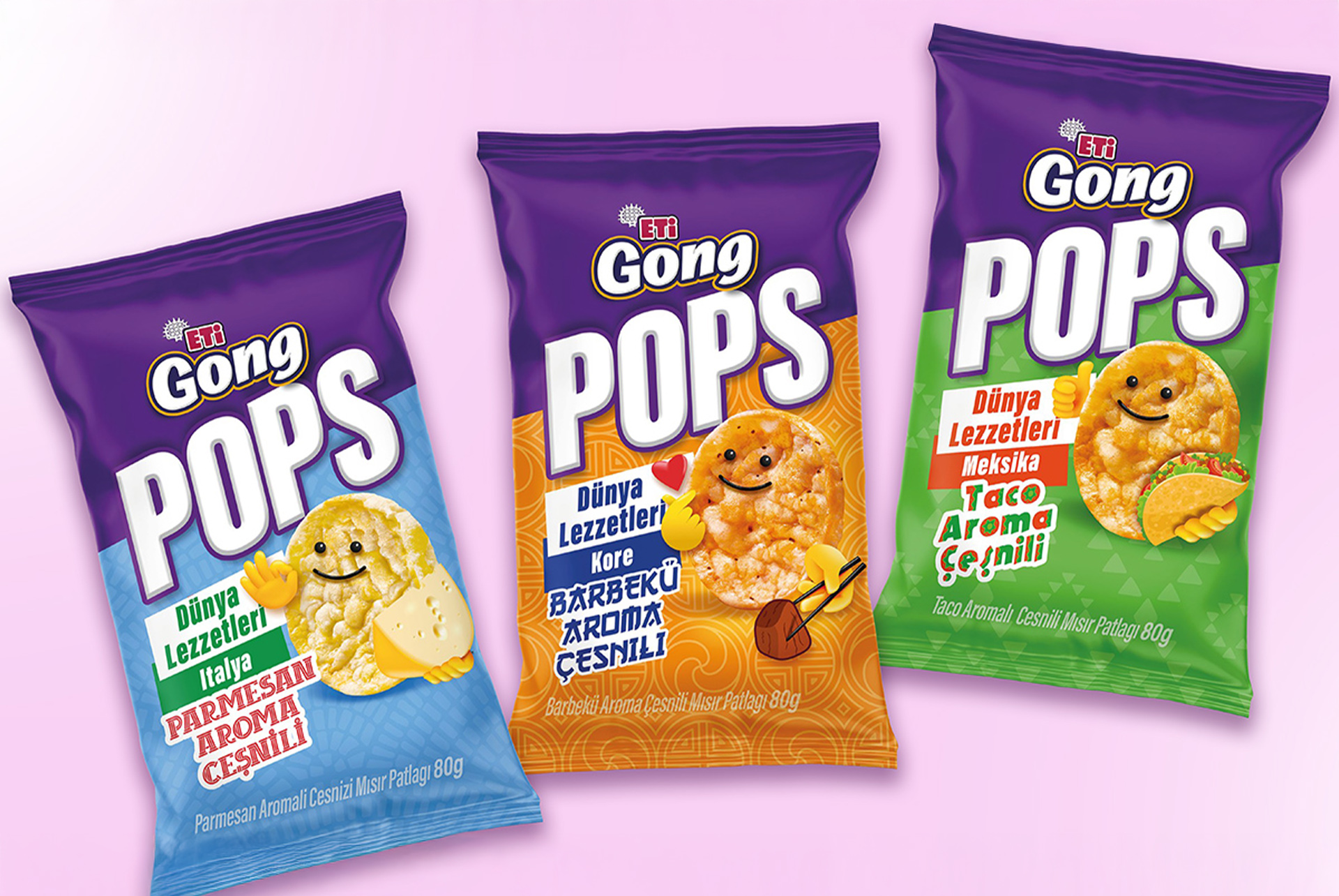 Eti Gong Pops “Dünya Lezzetleri” serisi, farklı ülkelerin özgün tatlarını kültürel referanslarla bir araya getiren tematik bir ambalaj tasarımı yaklaşımıyla geliştirilmiştir.